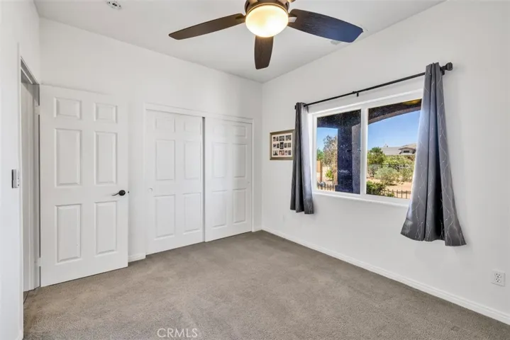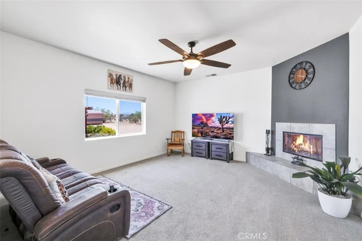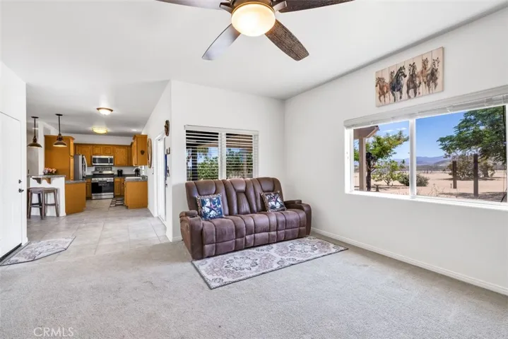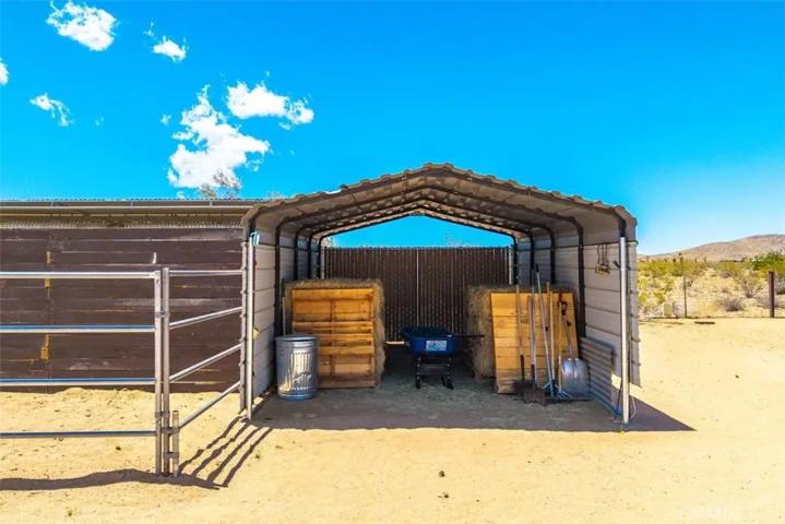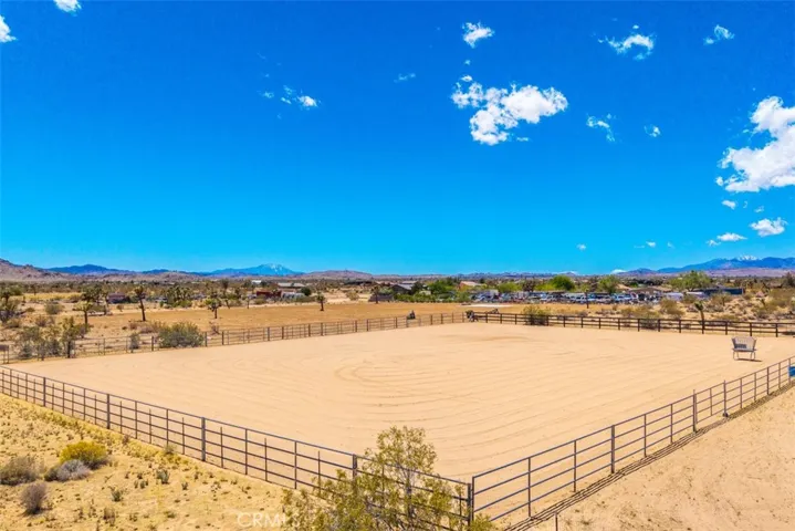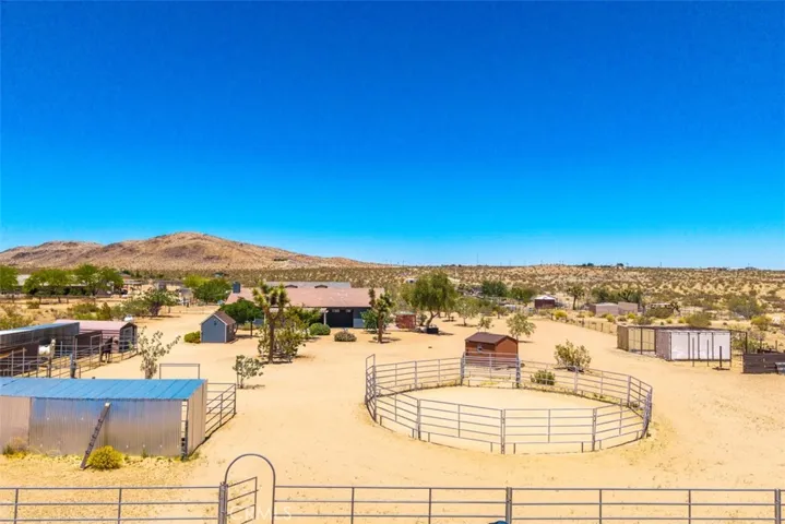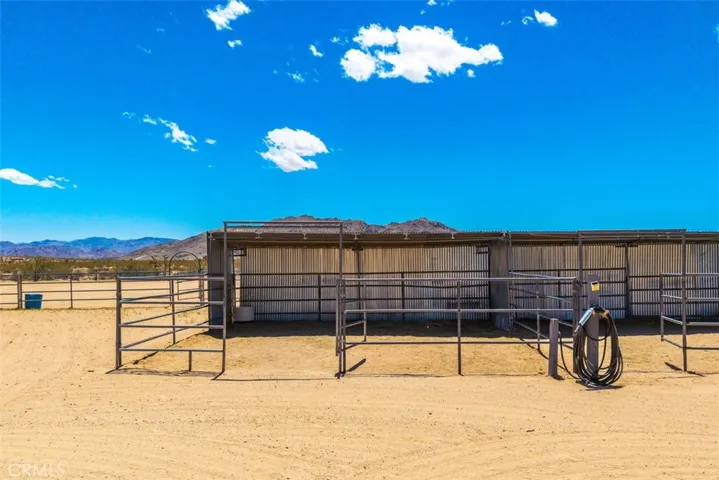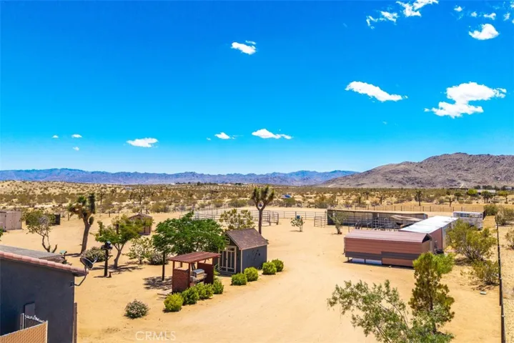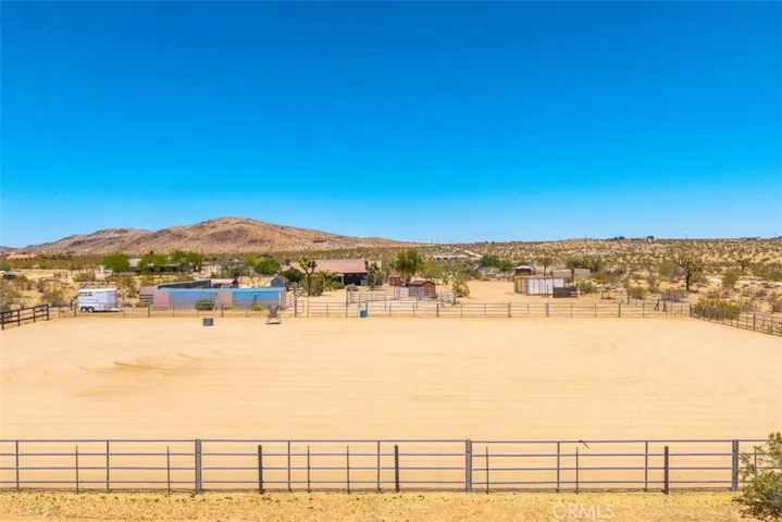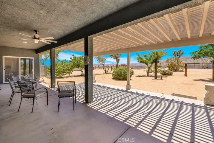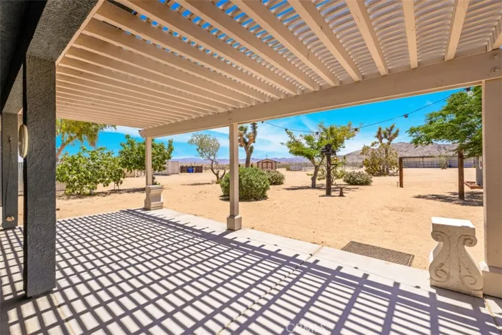 Price Correction Alert-This beautifully updated 3-bedroom, 2-bath equestrian estate is a rare find in Joshua Tree, offering both modern comfort and high-desert charm. Situated on 2.01 acres of fully improved horse property, this 2007-built home features fresh interior and exterior paint and a new mini-split system for energy-efficient cooling. Inside, enjoy an open floor plan with a cozy living room and fireplace, a spacious kitchen with granite tile countertops, a breakfast bar, and a pantry—plus direct patio access from both the living room and the primary suite. Step outside to a large covered back patio, ideal for stargazing, outdoor dining, or entertaining at the custom barbecue area. The backyard includes a hobby shed with electricity, a garden shed, a fountain, and mature fruit and nut trees—fig, nectarine, pomegranate, almond, apple, and pistachio. For horse enthusiasts, the property is equipped with four covered stalls (24′ x 24′), a 60-foot round pen with additional covered stall (90′ without), a 175’ x 200’ working arena, water trough, two tie bars for saddling, a tack shed, and a feed storage area that can be converted into an additional stall.