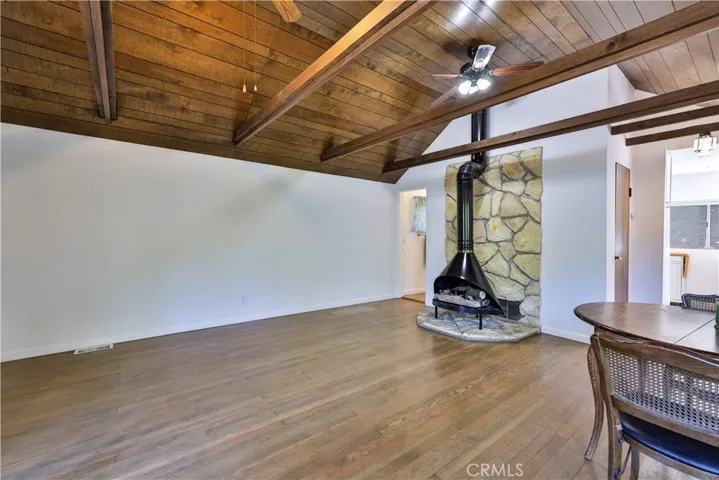 Inside, you’ll find original wood floors and high ceilings that enhance the classic cabin ambiance. A stand-alone gas fireplace adds warmth and charm for those chilly winter nights. The updated kitchen features modern cabinets and countertops, blending style with functionality.