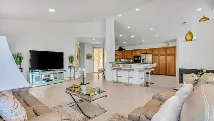 Simply elegant. Step into your very own oasis in the Desert Princess! This gorgeous home boasts one of the LARGEST lots, offering you unparalleled privacy with beautiful hedges surrounding your stunning backyard with views of South AND West mountains, and located on Cielo 5 fairway. Extra-large patio extends around the side of the home with a Sunsetter automatic awning with lighting. New BBQ. Inside, you’ll find a pristine, turnkey home with all tile flooring, modern lighting, and upscale furnishings that stay with the property! Bonus room off guest bedroom for office or extra place for guests. As a bonus, with an accepted offer, this home will come with a 2024 4-seater golf cart with only 350 miles and a golf club stand, perfect for tooling around Desert Princess or playing 18 holes with friends. Newer blinds, some automatic, in all rooms. The home is situated on a lot that has no immediate neighbors on the left. This villa has been well taken care of by the original owners. This is not just a home; it’s a lifestyle waiting for you to embrace.Land lease to 2069, monthly ground rent is $122.95.HOA DUES INCLUDE: 2 DVR or HD Cable boxes and service, High Speed Internet, grounds maintained to your door by HOA ground maintenance crew, outside pest control when requested, outside water, (you pay only for inside water). Gated community with 24 hour guard gate access, membership to Health and Fitness Center, Tennis, Bocce Ball, Pickleball. Discounts and preferred tee-times for owners at the Desert Princess 27-hole PGA Championship golf course, no initiation fees, rated among the best in the valley by GOLF DIGEST. This quiet community is away from the noise yet minutes from everything that is in Palm Springs; restaurants, shopping, casinos, an international airport, the Tramway, Art Museum, Theaters, and the Street Fair.