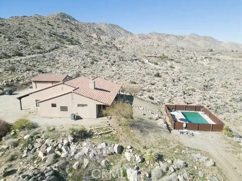 Escape to this gorgeous pool home on a generous 5 acre lot in one of Joshua Tree’s most desirable neighborhoods! Less than 3 miles from the National Park entrance, the location can’t be beat. At almost 2600 square feet this spacious home enjoys sweeping views of the valley, high ceilings, and a touch of southwestern flair. Enter the home through the antique wooden door brought up from Mexico and you’re greeted by custom wooden barn doors on either side of you leading to bonus rooms (originally den and dining rooms) now being used as additional bedrooms. Continue into the great room where you find a cozy family room complete with a pellet stove and reclaimed wood mantle. To your left is the dining area, and behind you the open kitchen. The kitchen features granite countertops, built in appliances, and tons of storage. Stand over your copper sink at the kitchen island and past your loved ones and onto the panoramic desert view through your sliding doors. On one side of the home you’ll find a half bathroom as well as a primary bedroom en suite w/ a sliding door for more views, and a gorgeous en suite bathroom featuring a jetted spa tub, double vanity, walk-in shower, and walk-in closet. This entire suite is filled with natural light during the day and a peaceful distance from the other bedrooms at night. The other side of the home features two more bedrooms each with their own in-room vanity and a jack ‘n’ Jill bathroom. There is a laundry room that includes two sets of washer/dryers, cabinets, and a utility closet. The home features Central heat and air conditioning (2 units), central vacuum, ceiling fans in all rooms, and Nest thermostats.