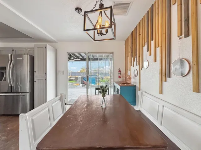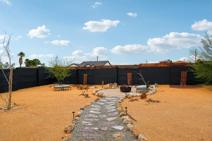Buyer to Assume Solar Lease. Discover this stunning 2-bedroom, 2-bathroom FURNISHED home set on a sprawling 20,000 sqft lot. Boasting exceptional curb appeal, leased Solar Panels, and a host of modern updates, this residence offers an inviting ambiance. The living room welcomes you with a stylish wood panel feature wall and an electric fireplace. It seamlessly transitions into the dining area, adorned with custom wooden wall designs, as well as the kitchen. The kitchen has been remodeled and features granite countertops, light grey cabinetry, an Included Refrigerator, and a convenient breakfast bar. Just off the kitchen, you’ll find a well-appointed laundry room with an Included Washer and Dryer, providing direct garage access. Both bedrooms are generously sized, with the primary suite offering a private bathroom complete with a dual-sink vanity and walk-in shower. A slider leads to a serene side yard, offering a covered pergola, hot tub, and pavers. A second bathroom with a walk-in shower serves guests and the secondary bedroom. The private backyard is an Entertainer’s Dream, showcasing a container pool, firepit, covered patio, and majestic Joshua trees. The property also includes 2 Accessory Buildings and ample flat, usable space, ready for your personal design! Located on a paved road and is currently an Active Vacation Rental. This is an unparalleled opportunity to own a truly remarkable home! Schedule your personal tour today!