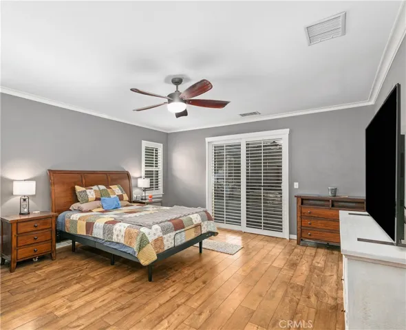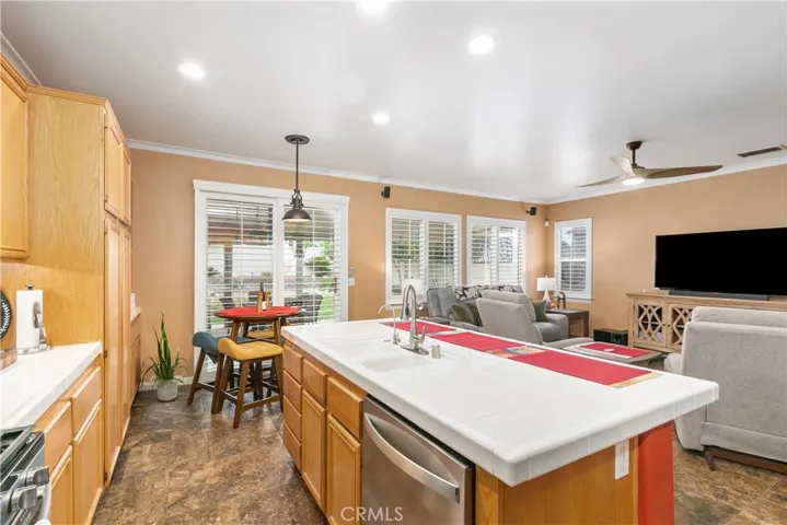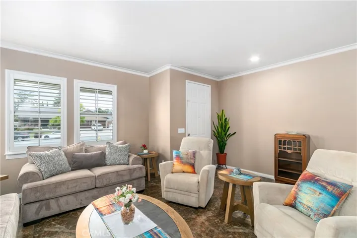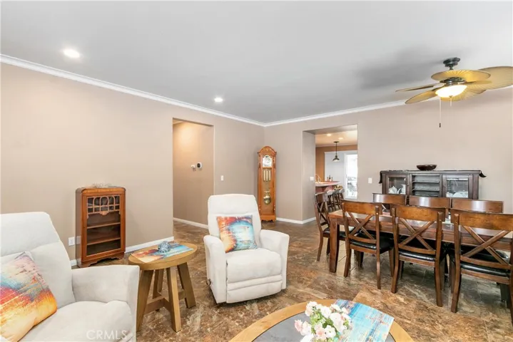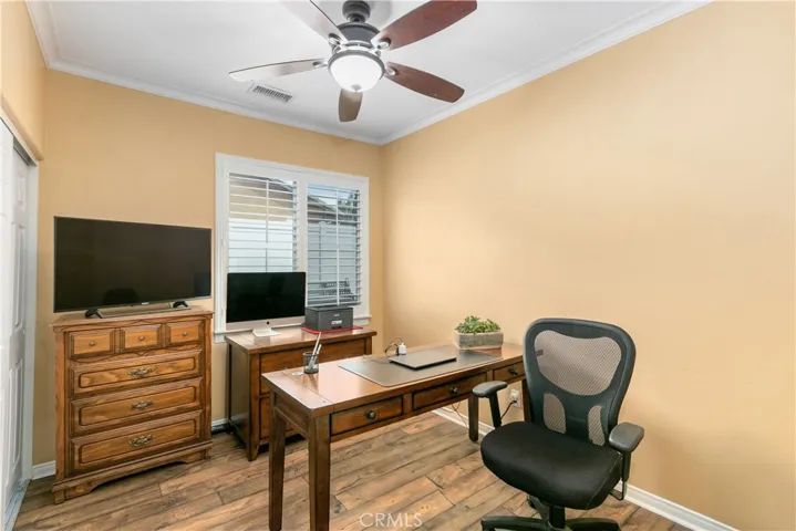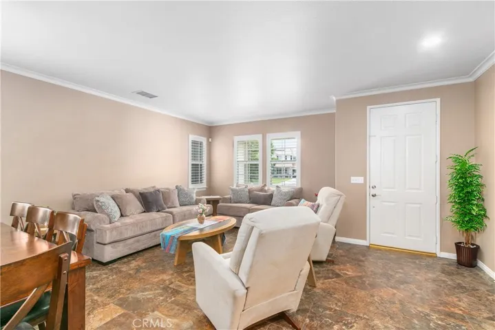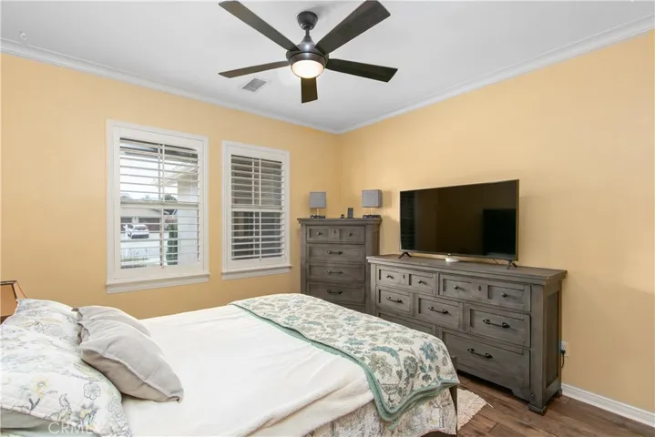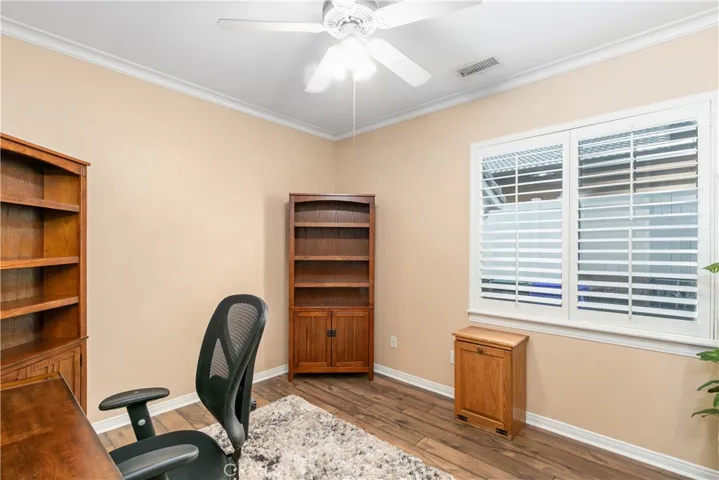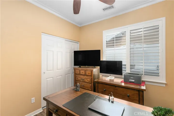 Crown molding, plantation shutters, recessed lighting, and ceiling fans throughout