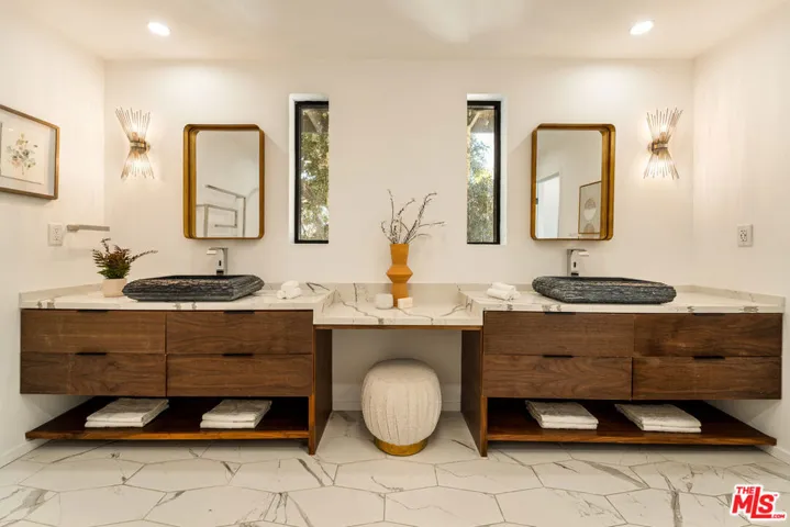 Experience the best of indoor and outdoor living, with natural light and easy flow throughout, in an urban oasis overlooking the Angeleno treetops and the cityscape. The main level is designed for entertaining, featuring an open concept living area and a modern kitchen with premium appliances. This entire space extends gracefully to a spacious deck, perfect for gatherings or quiet moments. Venture down to discover three well appointed bedrooms. The primary suite is a serene escape, complete with a cozy lounge area, a luxurious ensuite bathroom with dual vanities, and a walk in closet. This floor also includes a dedicated office and an additional ensuite bedroom featuring a standalone tub and shower. The lower level provides even more versatility with a central lounging area and two additional ensuite bedrooms, currently configured as a home gym and a charming kids’ room. Outdoor living is enjoyed at its finest with a welcoming front porch, expansive decks on every level, and a paved side area, offering multiple distinct spaces for relaxation and recreation. Ideally situated in the highly rated Carpenter Community Charter School district, and just minutes from the vibrant array of shops, cafes, and restaurants on Ventura Boulevard, this home truly delivers on location and lifestyle.