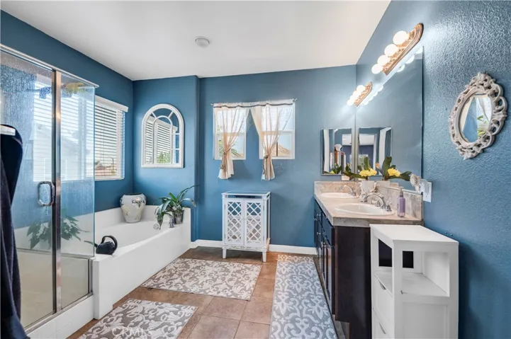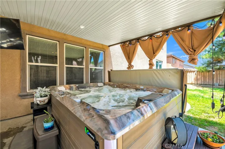 2 car attached garage with 8′ door, Tesla Charger, custom jacuzzi.