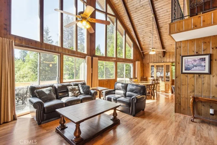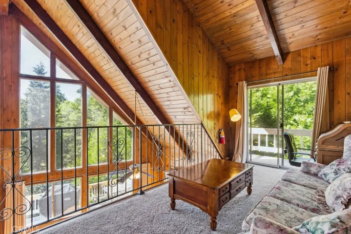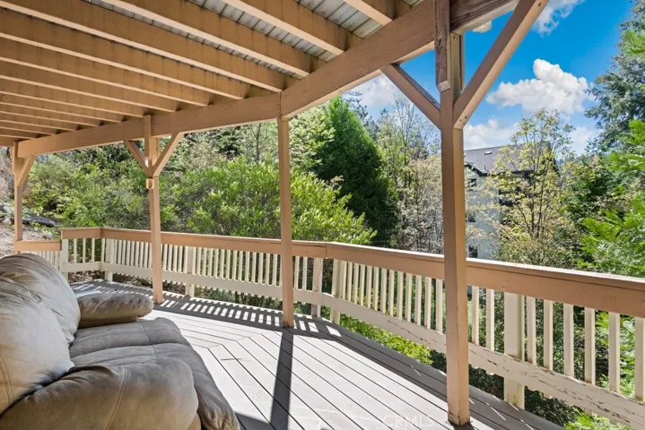 Privately Nestled Mountain Retreat with Incredible Views on Every Level. Experience peaceful mountain living in this beautifully situated multi-level home, offering incredible views of the trees and mountains from every level. Tucked away for privacy and surrounded by nature, this home features high ceilings with tongue-and-groove woodwork and exposed beams, paired with large windows that flood the interior with natural light and frame the scenic landscape. On the main living level, you’ll find a warm and inviting living room with a fireplace, dining area, and kitchen, all with access to a wraparound deck that offers panoramic views. This level also features two well-sized bedrooms and a full bathroom. The lower level welcomes you with a spacious game room that opens to a covered deck nestled among the trees—perfect for relaxing or entertaining. This level also includes a bedroom, laundry area, and a closet with shower for added convenience. Upstairs the top floor boasts a cozy loft with access to a private balcony and leads to the expansive primary suite, complete with a spacious en suite bathroom and treetop views. Located just minutes from Blue Jay Bay at Lake Arrowhead and a short drive to Lake Arrowhead Village. Whether you’re looking for a full-time residence or a serene mountain getaway, this property is a must-see.