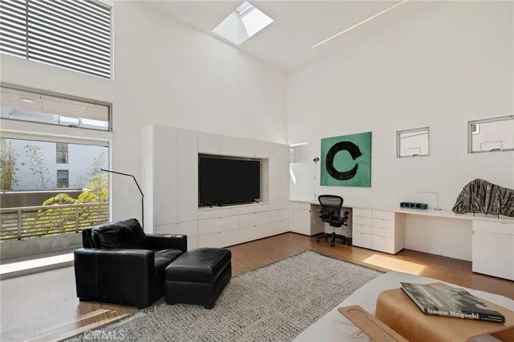 The home is outfitted with original international artwork, a dramatic floating ipe slat staircase illuminated by skylights, extensive built-ins, smart home systems, a two-car garage, and three extra parking spaces.