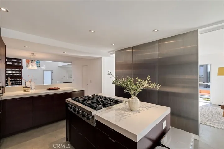 The open-concept first floor features radiant-heated concrete floors and a gourmet Henrybuilt kitchen with quartz countertops, a large central island, and ample storage. The adjacent family room with sectional seating and flat-screen TV opens to a private outdoor lounge with a sparkling pool, jacuzzi, and lush landscaping. The living room features Italian furnishings, a 70-inch TV, and sliding glass doors leading to a tranquil courtyard. The dining area comfortably seats eight.