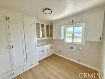 The kitchen area is both elegant and practical, featuring lots cabinetry, and striking black hardware. There’s ample storage for all your culinary needs, and the bay window above the laundry hookups adds a cozy, sunlit touch to the space.
