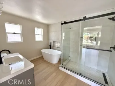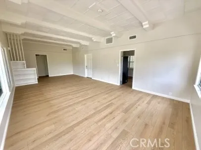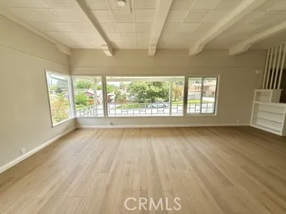 Step into a spacious open-concept living room featuring warm-toned wood-style vinyl flooring, vaulted beam ceilings, and a wall of windows that flood the room with sunlight and provide serene views of the landscaped yard. Clean lines and neutral tones create a relaxing, versatile space ready for your personal touch.