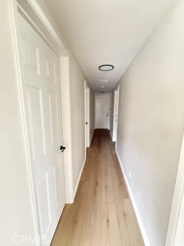 A long, bright hallway connects the living space to the bedroom and bathrom, with consistent flooring and modern light fixtures lending a cohesive, fresh feel throughout. Each room is easily accessible and thoughtfully designed for comfortable living.