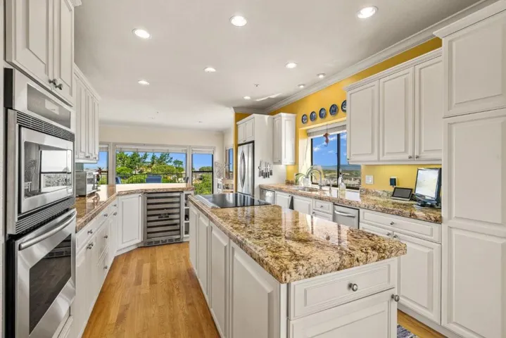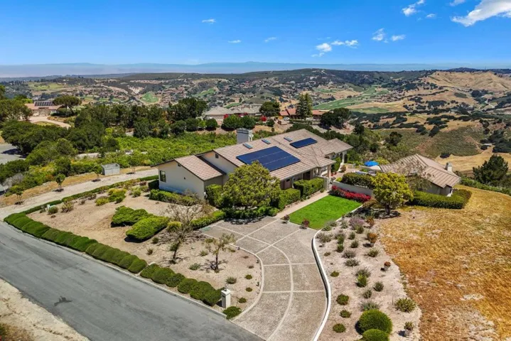 Bay Views, ADU, 8-Car Garage & More Set on a private 1.91-acre knoll with expansive views of the bay and the rolling hills along the Highway 68 corridor, this exceptionally maintained estate blends scale, comfort, and versatility. The main residence features vaulted ceilings, exposed beams, and sunlit living spaces that flow seamlessly to the outdoors. An oversized primary suite offers a serene retreat, while additional highlights include a media room and a 1,300-bottle wine cellar. The detached ADU adds flexible living options for guests or multi-generational needs. With an 8-car garage, owned solar, and true pride of ownership throughout, this home delivers efficient living and timeless appeal in a quiet, sought-after setting surrounded by natural beauty.