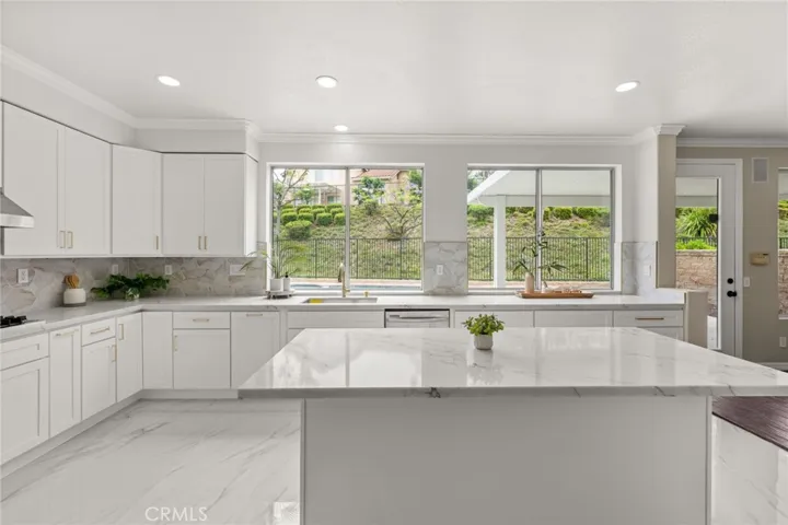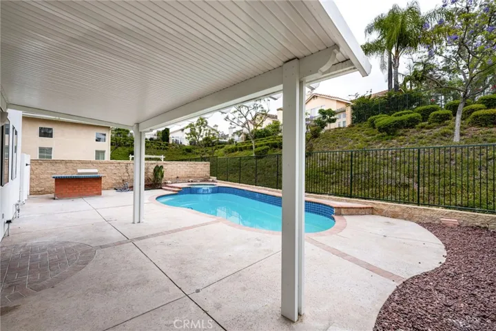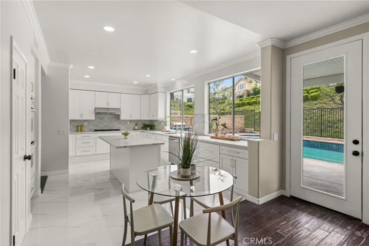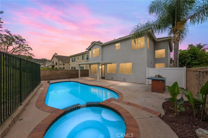 BACK ON MARKET!! NEWLY REFINISHED FLOORS. This two-story home is located in the highly desired Hillsborough Collection. Nestled in a tranquil cul-de-sac within a secure gated community, this two-story gem is family living at its best. Step inside to find soaring ceilings and a dazzling chandelier that compliments the formal living room and formal dining room. Beautiful Hickory wood floors have been refinished and give the home a light and natural feel. The completely remodeled kitchen is an entertainers dream with large island, plenty of chic quartz countertop space, brand new soft-close cabinetry, all complimented with gold accents. Downstairs also features a bedroom with closet and a full bathroom with a shower. The beautiful spiral staircase is the center piece of the home (which has also been refinished), leading up to the Primary and 3 additional rooms. The large Primary suite is a retreat with warm wall tones and 2 amazing sized closets, one with shelves and the other a large walk-in. The Primary bath features a relaxing tub and a shower. The 3 additional rooms feature new carpet and are all very spacious. Entire interior has been painted with colors that complement the accents throughout the home. The backyard is perfect for hosting a pool party with a sparkling pool and BBQ setup. High-rated schools are just around the corner, making mornings a breeze. With five bedrooms—including one downstairs—everyone gets their own space. Plus, a three-car garage wraps up this perfect package. (All new electrical outlets, recessed lighting, faucets, doors, baseboards, switches, front sprinkler system, front grass, garbage disposal, sink, downstairs vanity, mirrors)