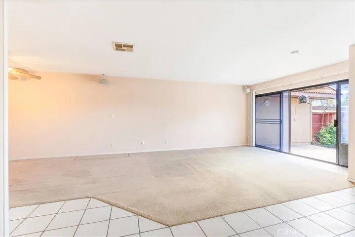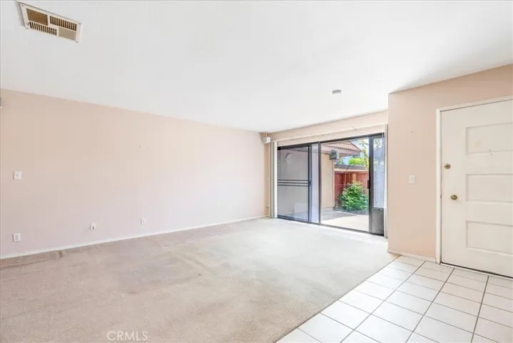 The spacious light-filled living room opens seamlessly to a private courtyard through sliding glass doors, creating a perfect setting for indoor-outdoor entertaining or peaceful relaxation.
