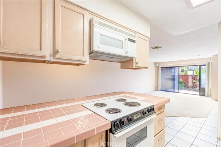 The light-filled kitchen with plenty of cabinets features a skylight and plenty of room to add a center island. Just off the kitchen, a discreet in-unit laundry closet provides everyday practicality without compromising style.