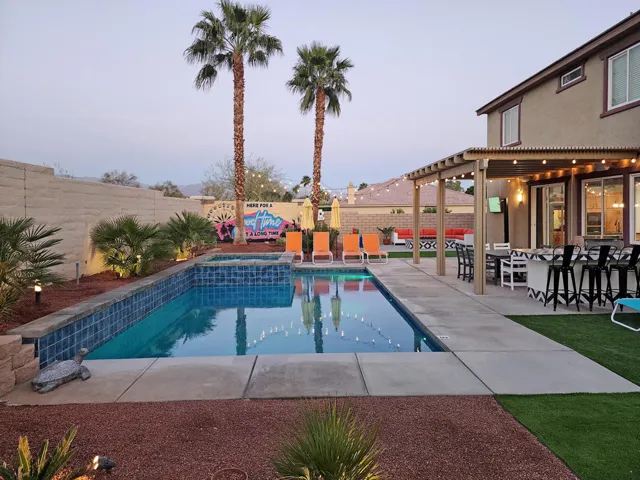 This stunning short-term rental property in Indio’s desirable Terra Lago community is a prime investment opportunity. Boasting 4 spacious bedrooms and a versatile den currently utilized as a 5th bedroom, this home is being sold fully furnished and turnkey, making it ideal for use as a second home or a revenue-generating vacation rental. The first floor features newer laminate plank flooring, while the kitchen is equipped with quartz countertops and a custom backsplash, offering both style and functionality. The 3-car garage has been transformed into a climate-controlled game room with polished floors, adding an extra layer of entertainment and value. Additional highlights include an electronic vehicle charging station and leased solar panels for energy efficiency. The backyard is an entertainer’s dream, complete with an alumna wood patio cover, an outdoor kitchen featuring a gas BBQ, and a large island to gather around with seating for four. You’ll enjoy a spacious yard that easily accommodates 8 sun loungers, a gas firepit, a putting green, This stunning short-term rental property in Indio’s desirable Terra Lago community is a prime investment opportunity. Boasting 4 spacious bedrooms and a versatile den currently utilized as a 5th bedroom, this home is being sold fully furnished and turnkey, making it ideal for use as a second home or a revenue-generating vacation rental. The first floor features newer laminate plank flooring, while the kitchen is equipped with quartz countertops and a custom backsplash, offering both style and functionality. The 3-car garage has been transformed into a polished, climate-controlled game room, adding an extra layer of entertainment and value. Additional highlights include an electronic vehicle charging station and leased solar panels for energy efficiency. The backyard is an entertainer’s dream, complete with an alumna wood patio cover, an outdoor kitchen featuring a gas BBQ, and an island with seating for four. Guests and residents can enjoy the outdoor shower, a spacious yard that accommodates up to 8 sun loungers, a gas firepit, a putting green, outdoor shower, and a ping pong table. Situated on a corner lot, this property also offers enhanced privacy for its occupants.