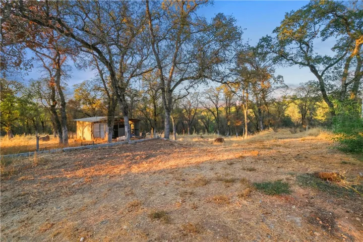 The property is fenced and cross-fenced, providing a secure and private backyard area. It includes a horse corral area and a sturdy pole barn, making it well-equipped for animals. The pad has been poured for a detached 2 car garage. Mature oak trees throughout the acreage add shade and character to the landscape.