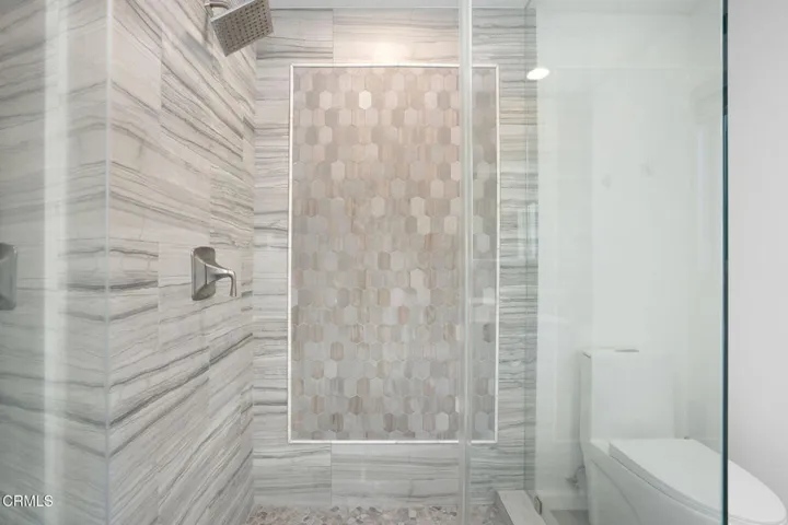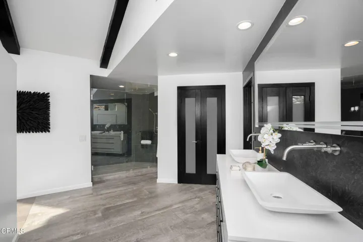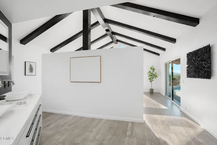 Perched well above street level and set behind a long driveway, this custom home has been refined with contemporary styling and offers unforgettable views and extreme privacy in idyllic Westlake Trails. A grand double-door entry opens to large, bright living spaces with wood floors, high-beam ceilings and an abundance of oversized windows flooding the home with tons of natural light and showcasing spectacular views throughout. The step-down living room offers views, a sleek fire feature and an adjacent wet-bar with Carrera marble and counter seating. The gorgeous kitchen is generously equipped with glass-front shaker cabinetry, Carrara marble counters and backsplash, a large island and high-end appliances including a built-in wine fridge and espresso machine. The open layout flows into a family room with a beautiful floor-to-ceiling tiled fireplace, more oversized windows and balcony access connecting a beautiful interior space with views of the Conejo Valley. This home offers two generously sized bedroom suites; one on the main level and one on the lower level, creating privacy and versatility for usage. In addition, a spacious loft with en-suite bath, walk-in closet and private balcony offers the flexibility to be used as a fabulous 4th bedroom suite, dedicated office space or other creative space. The sizable primary suite captures stunning views with a high wall of windows and a glass door accessing the pool, spa and outdoor lounging spaces. The high beam ceiling, modern chandelier and wooden feature wall add modern character to this sophisticated retreat. The en-suite bathroom is spacious and finished with dark stone, oversized shower, floating dual vanity, separate water closet, walk-in closet and more incredible views. Outside, the panoramic Conejo Valley views are a show-stopper in the rear yard. Relax and lounge on the patio, one of the multiple balconies or in the pool/spa surrounded by breathtaking views. Out front, a three-car garage and massive, long driveway provide ample parking or extra play space. A majestic oak tree is a perfect complement to the property, offering shade and a touch of whimsy with swings swaying gently beneath huge, twisting branches. Sweeping panoramic views, exceptional privacy and freshly redesigned with contemporary styling, this incredible custom home is a private haven perfectly situated in one of the most sought-after neighborhoods of Westlake Village.