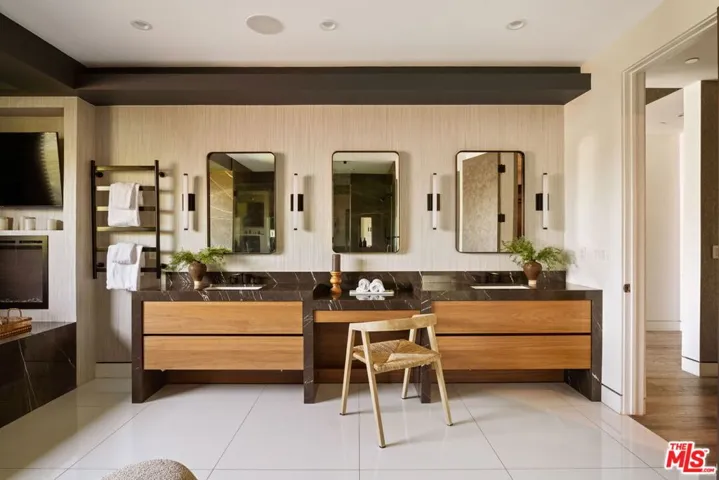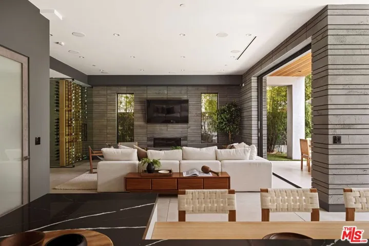 Step into this striking architectural residence, boasting a large rooftop with views of the Hollywood sign, Griffith Observatory, downtown LA, Century City and beyond! A private sanctuary set in one of Los Angeles’ most coveted neighborhoods. Designed for luxurious living and effortless entertaining, this home offers a seamless blend of sophistication, comfort, and cutting-edge innovation. A grand open-concept layout welcomes you with soaring ceilings, expansive walls of glass, and an abundance of natural light. The chef-inspired kitchen is a centerpiece, featuring a full suite of premium Miele appliances, sleek cabinetry, and an oversized island perfect for casual dining or social gatherings. A stylish family room and formal living area flow into a lush courtyard, anchored by a dramatic indoor-outdoor connection through disappearing pocket doors. From intimate dinners to large-scale events, the main level offers a full bar, a glass-enclosed wine wall, a media room, and a private guest suite. A floating glass staircase leads to the upper level, where you’ll find four generous ensuite bedrooms. The primary retreat is a serene escape with dual walk-in closets, a private balcony, and a spa-quality bath outfitted with a soaking tub, rainfall shower, double vanity, and high-tech amenities including a smart toilet and heated towel rack. For those who appreciate California’s signature indoor-outdoor lifestyle, the rooftop deck offers expansive panoramic views, a built-in outdoor kitchen, fire pit, and plenty of lounge space to take in the sunset. Down below, the backyard is a resort-style oasis with a zero-edge pool and spa, custom outdoor shower, and beautifully landscaped grounds surrounded by privacy hedges. This smart home is equipped with Crestron automation, integrated speakers, dual-zone climate control, solar power with Tesla wall batteries, EV charging, and a whole-house water filtration and softener system. Additional features include an executive office, fitness room, marble-accented fireplaces, and a secure two-car garage with gated driveway access. Tucked away in a premier location just steps from The Grove, boutique shopping, and top-tier dining, this home is a rare opportunity to own a modern masterpiece in the cultural heart of L.A.