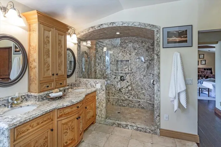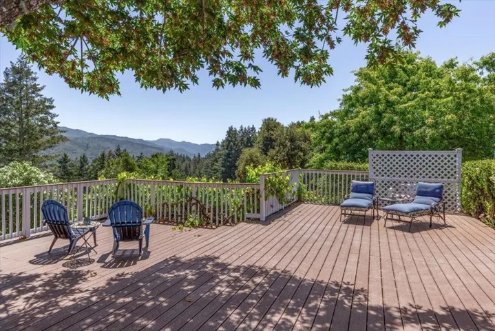 Amazing value close to town on a sunny acre with views and 5 car garage! This 4 spacious bedroom, 3-bathroom home is a haven of light and style. Formal entry leads to inviting living room, featuring high ceilings and abundant windows and views, complete with new carpets. The gourmet chef’s kitchen boasts granite countertops, a center island with a breakfast bar, stainless steel appliances, and garden windows framing mountain vistas. Formal dining room, pantry and laundry area. Two primary suites, one is a retreat with exposed wood beams, distressed wide plank flooring, gas fireplace, enormous walk-in closet with built-ins and a luxurious bathroom with a sunken tub, and a shower with a stunning granite backsplash that leads to a private deck for morning coffee. Back yard has expansive Trex deck with breathtaking mountain valley views, grassy area, a large side yard with garden and horseshoe pit. Car enthusiasts will love the attached 3-car garage, carport, detached 2 car garage with barn/workshop, and a vast cement parking area. Additional features include updated electrical systems, internal fire sprinklers system, public water (sjwater), water tanks, whole house generator, central vacuum and comcast. Easy drive to town or beach. Los Gatos Schools (Loma Prieta, CT & LG High).