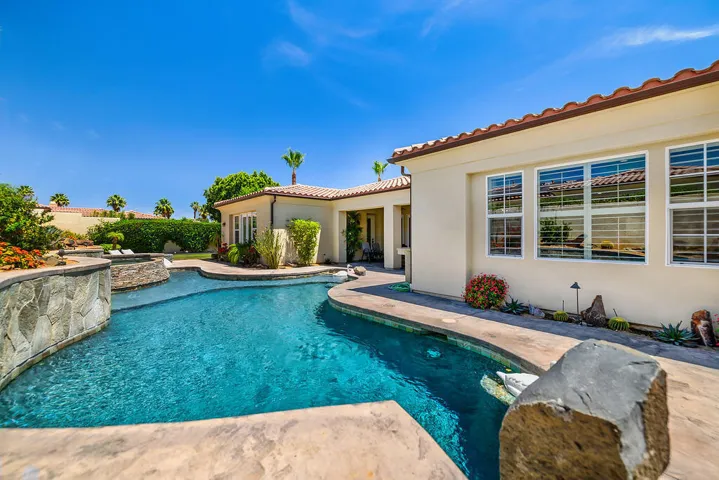 Luxuriously upgraded, 4 bedroom home in this prestigious gated development, adjacent to Mission Hills Country Club. This home is situated on a large, private, corner lot in the center of the development.There is a sumptuous main suite overlooking the pool, with soaring ceilings and a large attached bathroom, there is also a walk in closet. The large den is luxuriously appointed, with high ceilings, a raised fireplace and access to the enormous, sparkling, pool and spa.The remodeled, open chefs kitchen features top of the line appliances and quartz counter tops. This home is a very special property, the funishings are exceptional, no detail has been ignored.Available for the 2025-2026 season