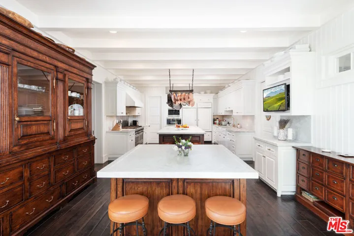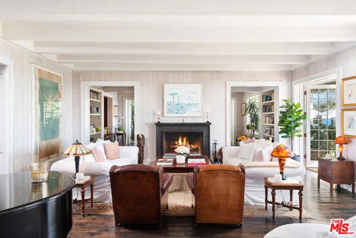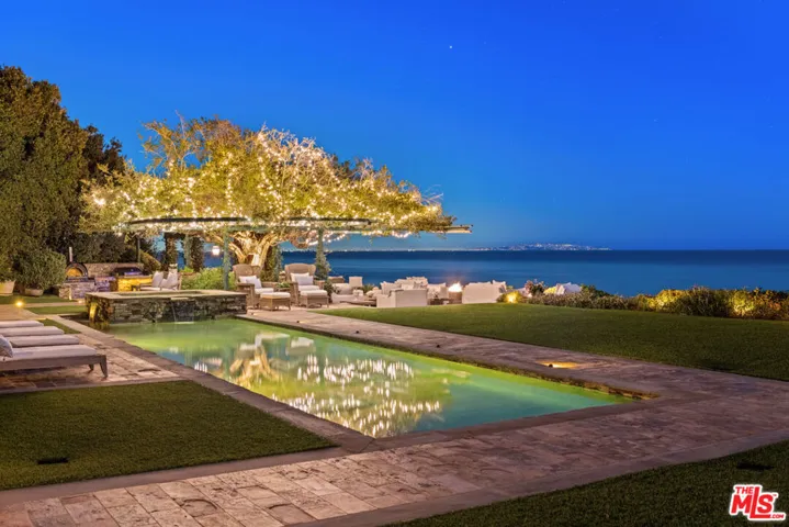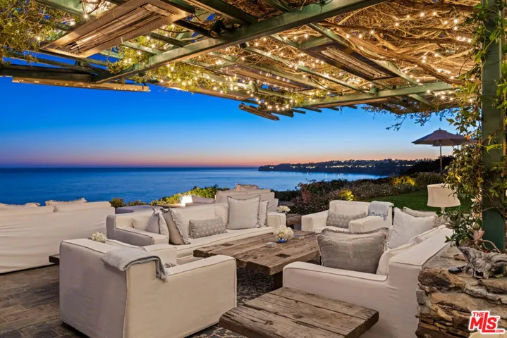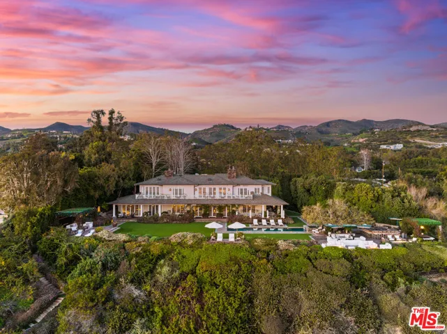 A perfect location, traditional elegance, and contemporary amenities add up to a truly luxurious lifestyle in this spacious, bluff-top Malibu compound. With entertainment industry cachet and sensational views, this ultra-private estate has been perfected for generous indoor-outdoor living and entertaining. At the end of a long, tree-lined drive, the 3-plus acre property comprises magnificent parklike grounds that command extravagant views from Point Dume to the Queen’s Necklace, ocean, islands, and sunsets galore. Beautiful interior detailing includes high beamed and coffered ceilings, skylights, large windows, exquisite millwork and built-in cabinets, multiple fireplaces, wide plank hardwood floors, and numerous French doors that open onto expansive ocean-view decks and grounds. The floor plan is open, with easy flow and maximum views. A dramatic double-height foyer leads into the elegant living room, which opens to a deep-covered and heated poolside portico that stretches the full width of the house and offers ample space for lounging, dining, and entertaining. Off the living room is a bright, window-lined family room that extends into a gorgeous wood-wet bar. Also, open to the living room is the formal dining room, with another fireplace and table seating for ten guests. The country kitchen is a professional chef’s dream, with two islands, a large pot hanger, Carrera marble countertops, bar seating, Viking, Wolf, and Miele appliances, a walk-in pantry, abundant cabinet space, and a charming breakfast area with a skylight and garden windows. The main floor also features a spacious recreation/game room with skylights and accordion doors to the backyard, an ocean-view office/sunroom with a built-in desk and doors opening onto the portico, plus a huge, two-tier screening room with comfortable couches. Completing the main floor are three en-suite bedrooms and two powder rooms. Upstairs, a fabulous wraparound library mezzanine overlooks the foyer. A hidden door leads to a living room/play area with a built-in desk and walls lined with shelves. Sliding doors reveal an en-suite office that could also serve as a bedroom. There are four beautiful en-suite bedrooms on this level, each opening onto a balcony, including the primary suite, which is a luxurious ocean-view getaway complete with fireplace, over-bed suspended TV, a lavish ocean-view bath, and multiple French doors onto the lounging deck outside. The estate’s backyard provides expansive options for recreation and entertaining, with a huge, illuminated “giving tree” at its heart. Features include multiple seating areas, a waterfall swimming pool, Jacuzzi in a heated pergola, a hanging swing, fountains, extensive turf, a covered outdoor living room, and an outdoor kitchen complete with barbecue, pizza oven, counters with bar seating, and private steps leading to the wide sandy beach below. The property’s many additional amenities include a double outdoor shower, a fully equipped security system, a security office, an optional on-site security team, a Sonos sound system, driveway parking for ten cars, and optional full-staff services. Extremely warm and welcoming, this classic estate is an achievement in elegance, comfort, and luxury.