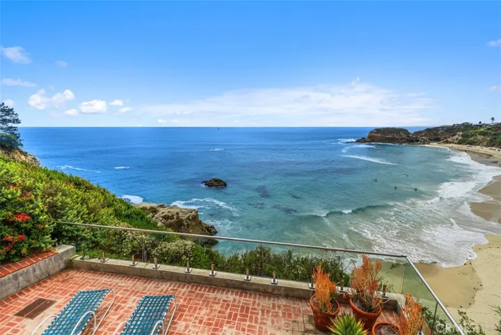 Enjoy impressive, unobstructed panoramic views of the ocean and sandy beach of Three Arch Bay, with iconic Whale Rock perfectly framed beyond. This stunning coastal furnished rental retreat offers the ultimate in oceanfront living. A beautiful garden greets you as you enter into the courtyard where a charming Dutch door opens into a bright foyer. The spacious living room features a cozy fireplace, and an oversized picture window showcasing the breathtaking views of Three Arch Bay beach. French doors open onto a private oceanfront deck—ideal for relaxing with the ocean breeze or enjoying unforgettable sunsets. The dining area features a beautiful chandelier, creating an elegant space for entertaining. The kitchen is warm and inviting, with French windows and doors, abundant counter space, six-burner Viking double oven with buffet area, Viking warming drawer, Sub-Zero refrigerator, Viking trash compactor, Bosch dishwasher, wraparound sink, generous cabinetry, and a walk-in pantry. A spacious den/TV room with vaulted ceilings, fireplace, garden skylight, and French doors opens to the peaceful interior courtyard. Upstairs, the luxurious primary suite features a king bed, large viewing window with sweeping ocean and beach views, walk-in closet, and en-suite bath with soaking tub, step-in shower, privacy toilet, and dual vanities. Situated adjacent to the bedrooms is built-in desk area with shelving and file drawers provides a perfect home office space. A second upstairs bedroom includes two twin beds, walk-in closet, and en-suite bath with step-in shower. The lower level offers a versatile space serving as 3rd bedroom or den, complete with queen bed, sitting area with 2 sofas, one with fold-out queen bed, mini kitchenette with fridge and sink, and charming en-suite bath with clawfoot tub and custom wood sink. Double doors open to a brick patio for alfresco dining with ocean views or continue down to the lower deck for sunbathing and relaxation. Perfect for seasonal stays or extended retreats, this home provides exclusive access to Three Arch Bay’s secluded beach with resident’s only access, tennis courts, clubhouse, and park. Experience the coastal Lifestyle at its finest with spectacular oceanfront views every day. Available SUMMER – call now for available dates.