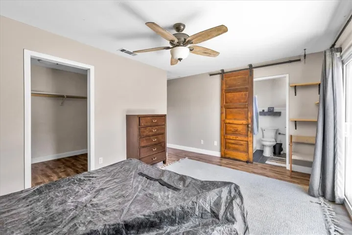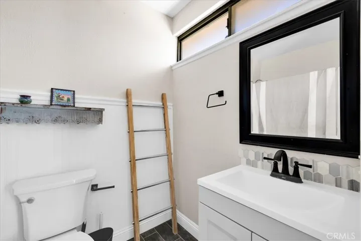 As you pass through a charming rustic barn door, you’ll find the full guest bathroom, which boasts a newer vanity, custom mirror, stylish lighting, built-in shelving, and a convenient bathtub/shower combo.