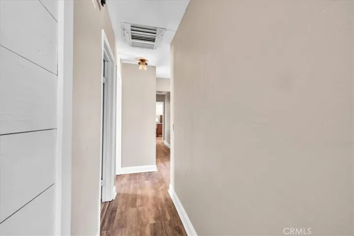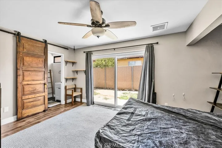 Each guest bedroom offers updated accents, while the primary bedroom suite features dual closets and a sliding glass door that opens to the patio. The primary bathroom showcases a wood panel accent wall, custom mirror, chic vanity, and tile flooring.