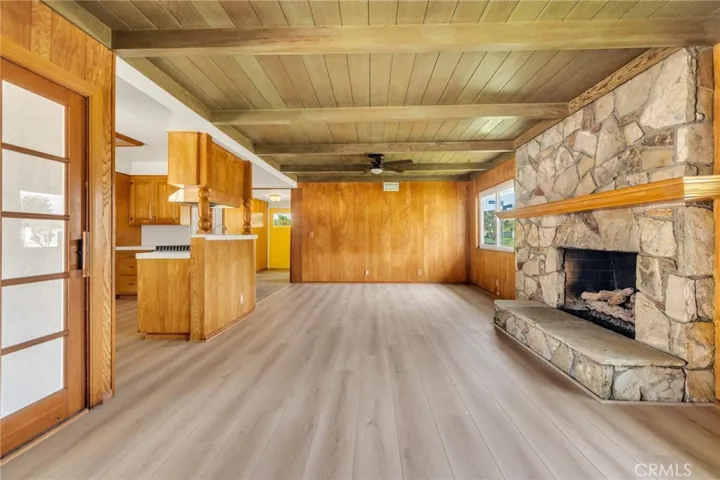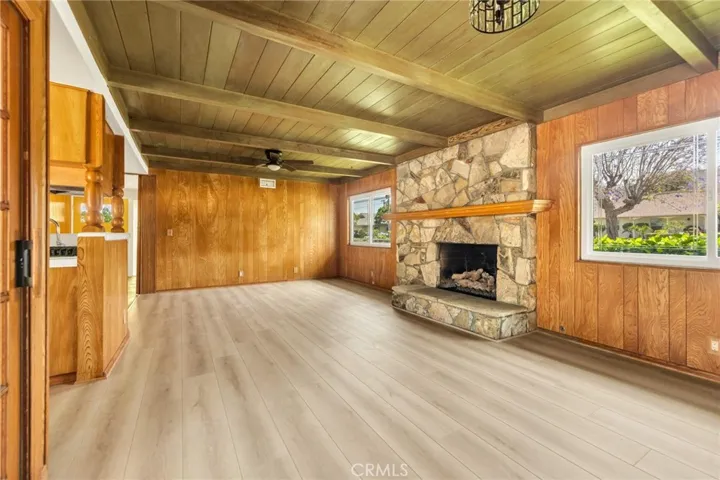 The living room features large diamond-cut windows, and the kitchen is equipped with new stainless steel appliances. The family room features a stone fireplace and opens to a backyard suitable for entertaining. The house has new paint and flooring throughout. The property features a two-car garage and a long driveway, providing ample parking.