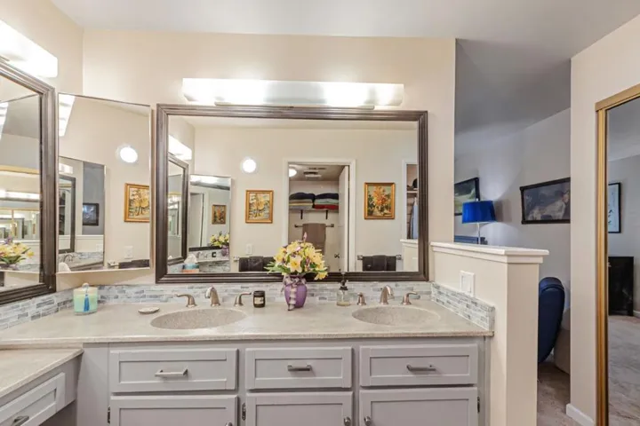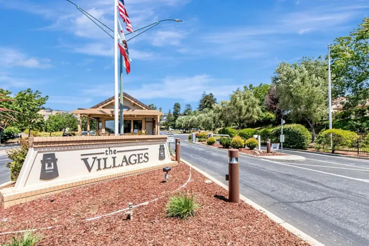 REDUCED —-End Unit Condo with Huge Sunroom for all weather use and Private front Courtyard for entertaining. *** Move in Ready with extra Den or Office *** Great home for the active working senior. *** Come home, unwind and enjoy Country Club Living. *** A 55+ Gated, Senior community, close to all freeways is The Villages Golf & Country Club, located in the Evergreen Hills of Silicon Valley. *** This home has 1649sf, 2 Bedrooms plus Den, 2 Baths, remodeled kitchen and nook with lots of cabinets and countertops, all stainless appliances, laminate floorings in all traffic areas with carpet in bedrooms and den, living room with cozy fireplace and view of hills, separate dining room plus a wonderful Sunroom surrounded by windows and sliders (ready to enjoy year-round), your ensuite bedroom opens to sunroom with private views and the separate guest bedroom has slider to front courtyard, large laundry room with washer & dryer has access to one car attached garage plus nearby carport and lots of guest parking. **** Country Club Living includes: 24/7/365 Security gate, 2 Golf courses (9 hole & 18 hole), putting and driving ranges, 4 Swimming Pools with hot tubs and showers, Tennis, Bocce & Pickleball, State of the art Fitness Center plus miles of Hiking Trails.