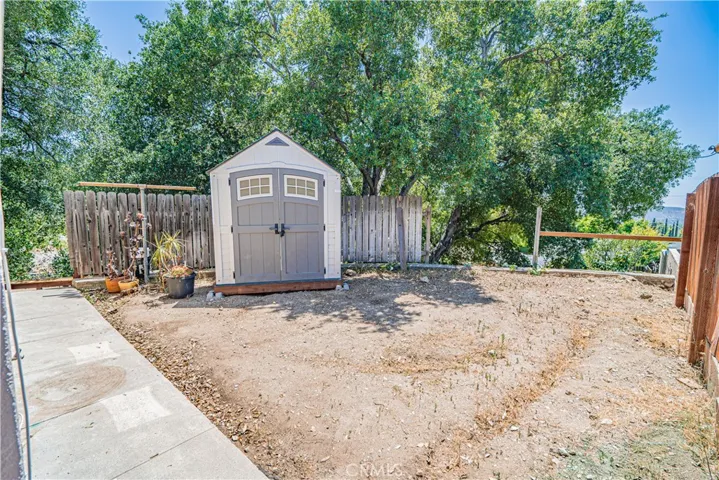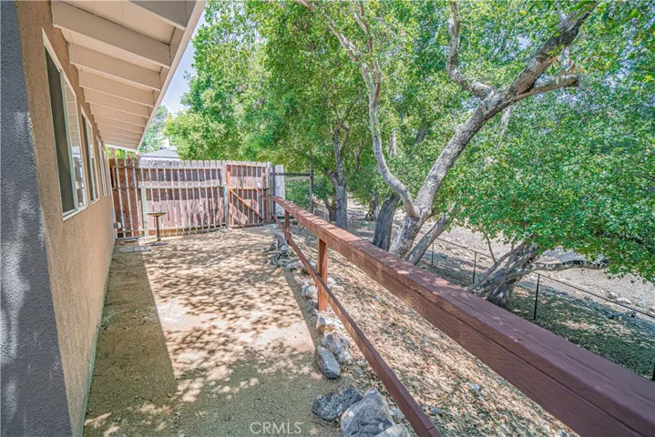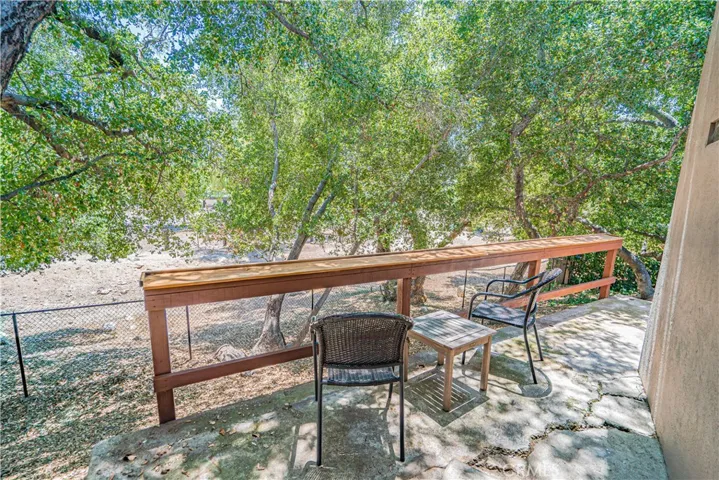 The back yard has serene feeling with multiple oak trees, views of the mountains and some privacy.