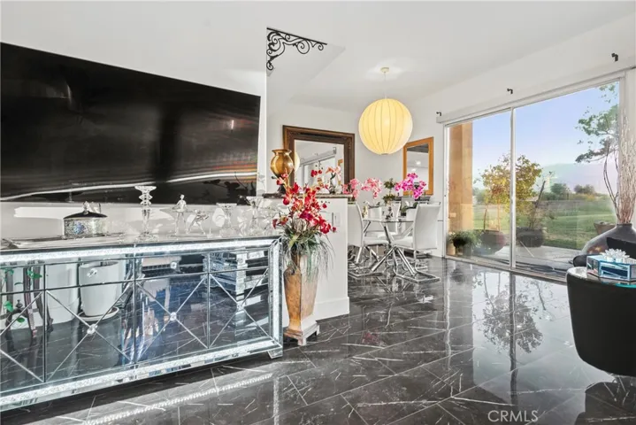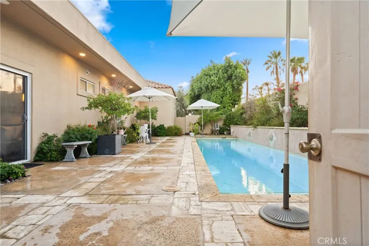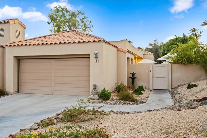 This home has its own private pool!! No land lease, you own the land. This is the best value in Mission Hills!! Experience the pinnacle of resort-style living in the guard gated Mission Hills community. This exceptional residence, discreetly positioned at the end of a tranquil cul-de-sac, offers unparalleled privacy and captivating views of the second hole on the renowned Pete Dye golf course. Spanning 1,332 square feet, the home features two generously sized bedrooms and two meticulously renovated bathrooms, providing an ideal sanctuary for both relaxation and entertainment. The interior boasts beautiful Nero Marquina black tile flooring throughout, complemented by 6-inch baseboards, door jambs, and contemporary hardware. The kitchen is appointed with smart stainless steel appliances, sleek countertops, and modern faucets, all contributing to a fresh and contemporary ambiance. Smart home features include remote-controlled sun blinds and freshly painted interiors that enhance the home’s bright and inviting atmosphere. Step outside to your private oasis, where a pristine pool adorned with four cascading fountains awaits, creating a serene environment for relaxation or entertaining. Three sliding glass doors, two of which open directly to the golf course, facilitate seamless indoor-outdoor living and offer breathtaking views of sunrises and sunsets. Beyond your private pool, the community offers additional amenities, including a pool and Jacuzzi, perfect for outdoor gatherings with stunning views of the golf course and surrounding mountains. The two-car garage includes attic space with a pull-down ladder and plywood flooring for additional storage, complete with lighting. Ample street parking is also available, enhancing the convenience of this private retreat. Facing west, this home offers breathtaking sunsets and an idyllic setting for relaxation. The HOA includes trash, cable, internet, earthquake insurance, roof maintenance, and a guard gate, providing peace of mind and convenience. A short golf cart ride takes you to both the Mission Hills clubhouse and the Westin Resort, where golf, fitness, tennis, and pickleball memberships are available. Embrace a lifestyle of luxury and tranquility in this exceptional Mission Hills residence.