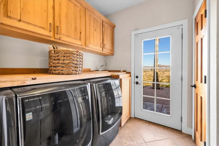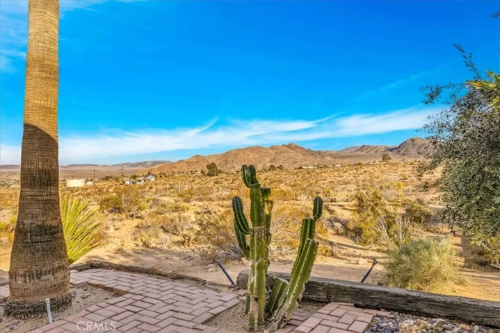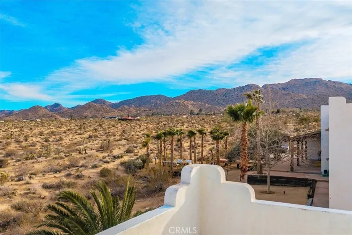 The meticulous landscaping surrounding the property includes Joshua trees, cacti, cholla, and palm trees throughout, enhancing the beauty and authenticity of this Santa Fe-style home. Immerse yourself in the awe-inspiring vistas that stretch out before you, showcasing the raw beauty of the desert landscape.