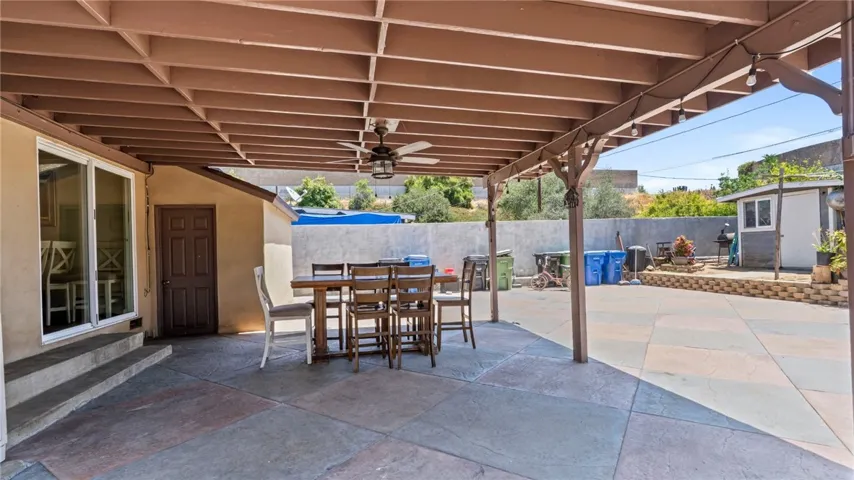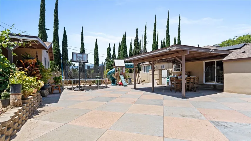 This versatile property features a 3 bed, 1 bath along with an additional bathroom on the exterior. Permitted ADU offers: 2 bed & 1 ba, providing flexible living arrangements. The main home offers softwood flooring in the living and dining areas, bedrooms, and hallway. Interior updates include granite countertops in the kitchen, modern low-voltage recessed lighting, and mostly newer vinyl windows. The property is equipped with central air conditioning and HVAC, a 200-amp electrical panel, and a whole-house water softener system. Solar panels are installed (owned) & will be paid through the close of escrow. Outdoor areas include a covered patio, multiple shaded sitting areas, and a designated play space. The detached ADU includes its own kitchen, bathroom, and living area. Conveniently located near the 5 Freeway, schools, parks, and shopping centers.