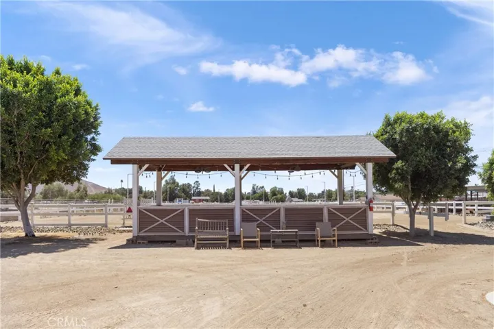 A pristine ¾-acre sand arena—professionally lit for night training—is fully fenced with white rails and comes equipped with jump standards and obstacles ideal for show jumping, dressage, or general flatwork. A spacious, covered viewing deck overlooks the arena, complete with seating and ambient string lighting—perfect for gatherings, lessons, or client events.