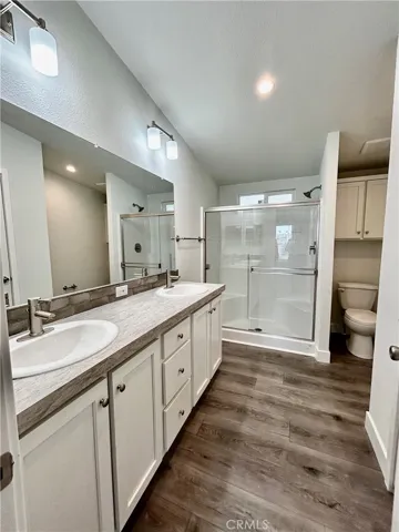 The primary suite is a true retreat, featuring a walk-in closet, double sinks, and a luxurious walk-in shower in the private en-suite bathroom.
