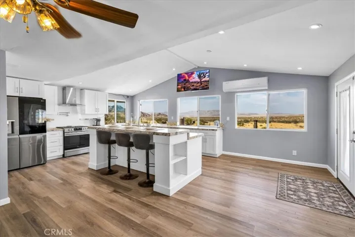 Escape to your own private desert retreat with this charming 2-bedroom, 1-bath home tucked away on 5 scenic, fully fenced acres. Thoughtfully updated and full of character, the heart of the home is a beautifully remodeled kitchen featuring granite countertops, stainless steel appliances, a prep sink in the island, and a walk-in pantry. Large windows frame stunning eastern views, welcoming in breathtaking sunrises each morning. The updated bathroom includes a sleek walk-in shower, while the cozy fireplace with insert adds warmth and ambiance on cooler nights. Wood-look laminate flooring flows throughout, and the entire home has been freshly painted inside and out. A spacious carport and shed offer protection for your vehicles, and a generous greenhouse plus an additional outbuilding make ideal spaces for hobbies or an art studio. Full RV hookups, including 50-amp electrical service, septic, and water, add convenience and flexibility for your out of town guests.. Just minutes from local favorites like La Copine, Pappy & Harriet’s, Giant Rock, and Joshua Tree National Park, this peaceful haven offers expansive views in every direction.