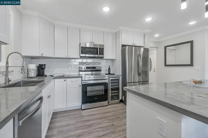 OVER $50K in PRICE IMPROVEMENT!! Totally TURN-KEY! Furniture included, if desired. Corner end-unit, Sonoma Wrap model offers quiet, privacy & ample space, inside & out. Fall in love with this stunning One-of-a-Kind, custom-designed remodel with a modern flair! 2 BD/2 BA, plus large-enclosed den, +/- 1,150sq ft. Come by to view this open, spacious & bright home! New doors, new windows, new hardware & decorative lighting, recessed lighting & crown molding everywhere, new paint, Nest thermostat & much more…Huge window added in dining area & another in kitchen, opening up to nature. Kitchen features new SS appliances plus wine refrigerator for easy entertaining. Gorgeous lunar quartz countertops & peninsula, with shaker cabinets that surround the kitchen to dining areas for lots of space/storage. Living room has sleek built-in electric fireplace to relax. Need more cabinets for your books? You got it! Custom den expansion created to use as your office or hobby room. Primary bath is beautifully designed with large, tiled walk-in shower & wide dual-sink vanity. Inside W/D combo gives you more time to go have fun at Rossmoor’s 55+ active senior adult community. Enjoy golf courses, tennis & pickleball courts, 3 swimming pools & fitness center, restaurant, clubhouse, event hall…