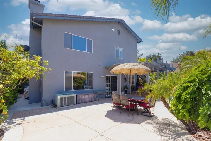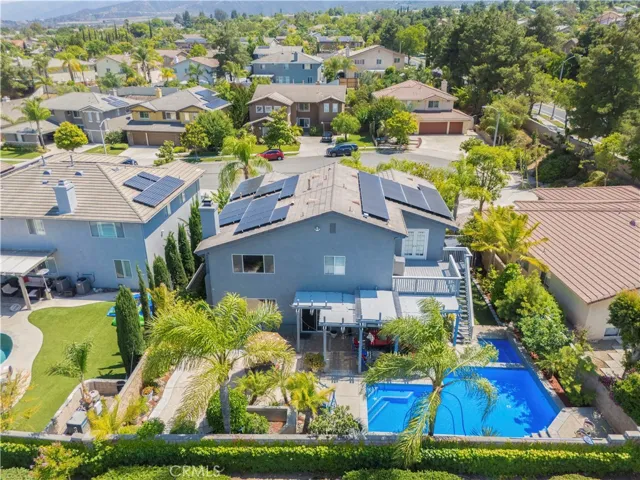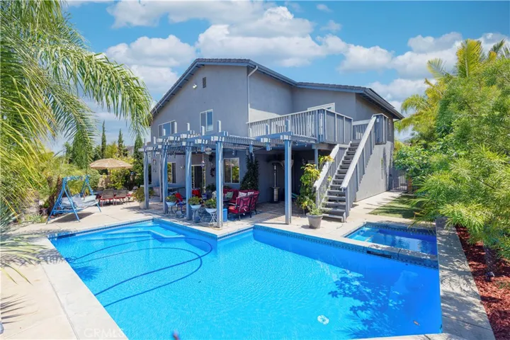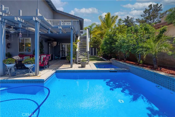 The primary suite boasts a large walk-in closet, an en-suite bathroom, and a balcony with gorgeous city light views. A dedicated laundry room with a built-in cabinets adds to the home’s functionality. Step outside into your private backyard oasis featuring a newly epoxy-coated pool and spa, perfect for relaxing or entertaining friends and family.