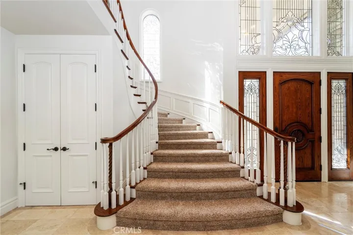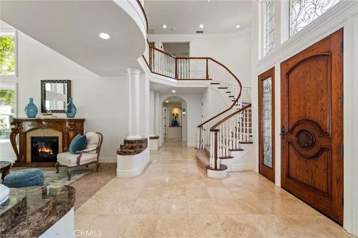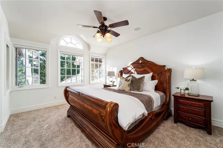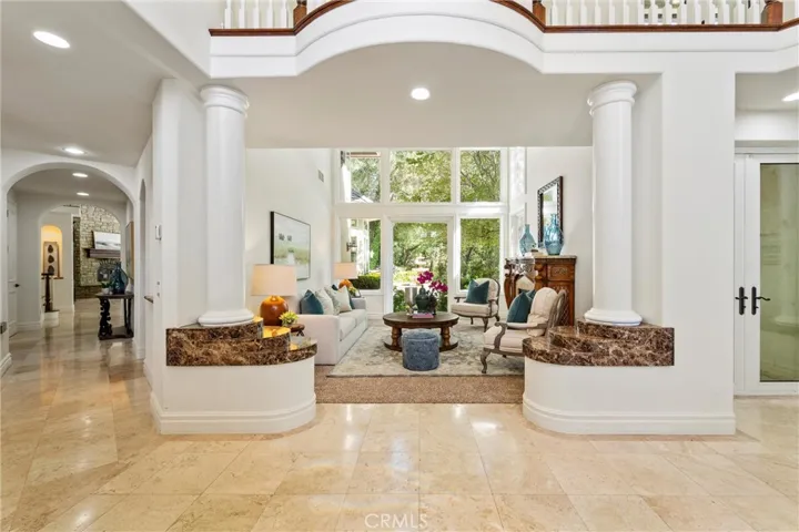 Inside, sophistication meets comfort. Soaring vaulted ceilings invite in sunlight, while the chef’s kitchen is fully equipped with premium appliances: built-in refrigerator, 6-burner stove, dual dishwashers, two microwaves, and double ovens. Custom Kitchen features include sleek granite counters.