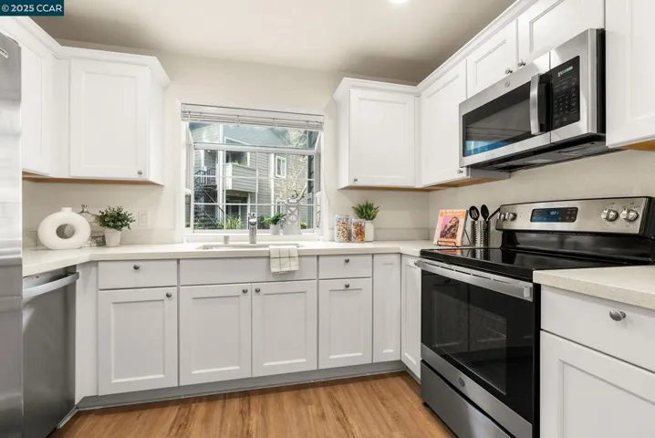 Experience resort-style living in this street level bottom floor 1-bedroom, 1-bath condo nestled in the Oakland Hills. Tucked within a secure, gated community, you’ll enjoy a sparkling pool, two hot tubs, a gym with sauna, and two tennis courts. This home boasts fresh carpet and new flooring in the kitchen, entry, and bathroom. Dual-pane windows fill every room with natural light, and the fully equipped kitchen features a greenhouse window, stainless steel sink and fridge, dishwasher, and garbage disposal. Step outside to private patios off both the living room and the bedroom, which also offers a walk-in closet and in-unit stackable washer/dryer. With easy access to the 580 freeway and nearby hiking trails at Leona Canyon, you can enjoy both urban convenience and a peaceful escape. Don’t miss this rare Oakland Hills gem—make it yours today!