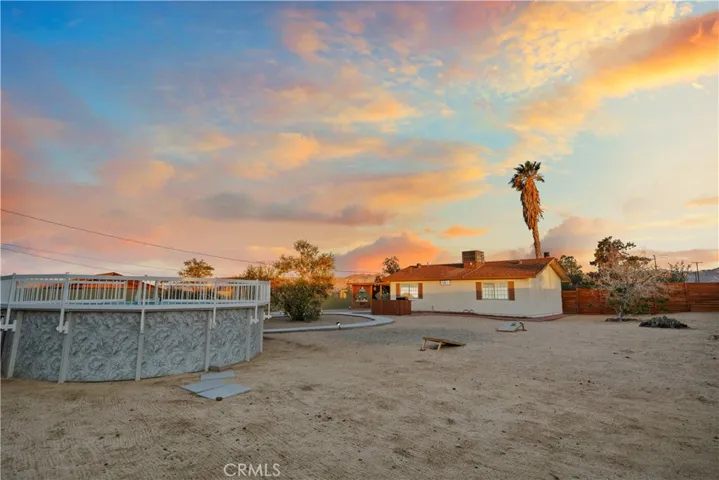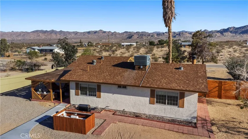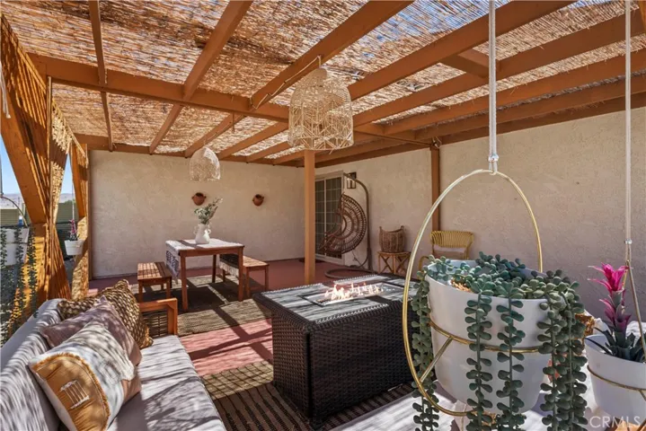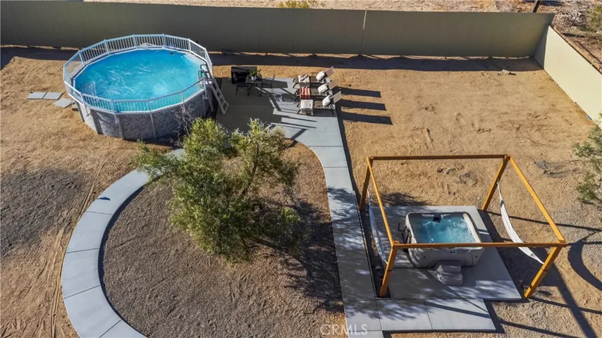 But the magic really begins out back—where the private, fenced backyard opens to sweeping ridgeline views of Joshua Tree National Park. The outdoor space was made for stargazing and slow mornings, featuring an above-ground pool, bubbling spa, swaying hammock, and a handcrafted gazebo with striking diamond woodwork that sets the scene for long, lingering afternoons and glowing desert sunsets.