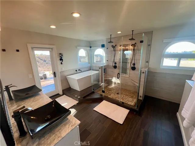 Inside, you’ll find a sprawling open-concept layout with large sliding windows framing the view, a chef’s kitchen featuring dual ovens, indoor grill, massive walk-in pantry, and full dining area. The great room includes a pool table, 75” TV, soundbar, reclining sectional, and ambient fireplace. The expansive primary suite features a spa-style bathroom with soaking tub, dual rain showers, and dual sinks. Four additional bedrooms offer flexible sleeping arrangements for guests or extended family.