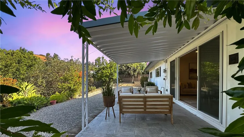 The spacious living room is highlighted by a beautiful fireplace and oversized glass sliding doors that open to a tranquil backyard, great for relaxing or entertaining. Enjoy a peaceful retreat featuring a covered patio, a scenic view, and a wide variety of mature fruit trees, including orange, lime, lemon, pomelo, guava, pomegranate, and loquat. Drought-tolerant plants surround the yard, creating a low-maintenance oasis.