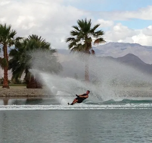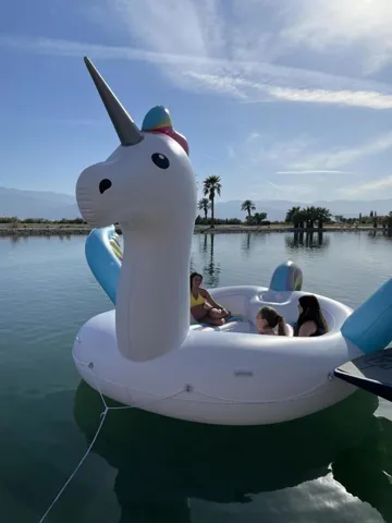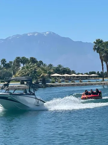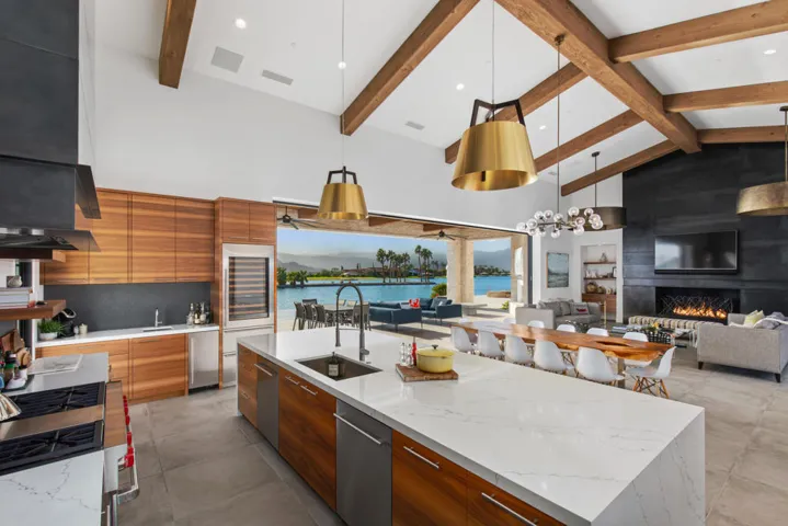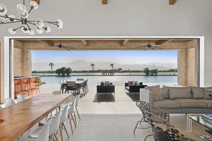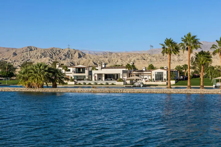 This luxury escape is a unique vacation home, available fully furnished & ready for you to enjoy. This home boasts its own private beach & boat dock, six oversized en-suite bedrooms, upstairs playroom, gym & an infinity pool, all overlooking a water sport lake . The perfect outdoor setting, Shadow Lake Estates is nestled in the base of the Indio hills with an expansive southern view of the entire Coachella Valley through its broad windows & panoramic backyard. This smart modern home has high ceilings, motorized shades, & a minimalist feel, but at just under 7000 sqft it still feels comfortable. With a large fireplace in the living room, an island kitchen fit for royalty, & floor to ceiling windows that slide back to open up the house to the rising morning sun shimmering off the lake. Get out of the city & find yourself back in the elements, on the water during a winter that averages daily highs of 70. Go hiking in the nearby hills, drive 20 min to Palm Springs & have a night out! Or, wait for the annual Coachella Music & Arts Festival, stay 15 min away from the venue in a spacious lake house perfect for pool parties & BBQs on the dock! This home is a one of a kind getaway, you won’t find anything like it in all of Southern California.