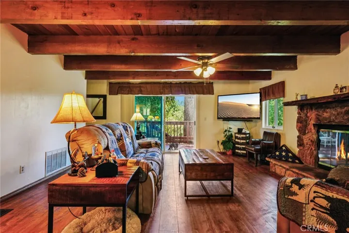 Welcome to 463 Delle Dr in Crestline—a mountain home with the perfect balance of comfort, charm, and real-life usability. Just minutes from Lake Gregory, this 2-bedroom, 1.5-bath property features an open-concept living area with tongue-and-groove wood ceilings, a classic rock fireplace, and abundant natural light thanks to its sunny southern exposure. Step out onto the oversized entertaining deck and take in sweeping ridge and mountain views—ideal for hosting friends, morning coffee, or a quiet evening with a glass of something good.