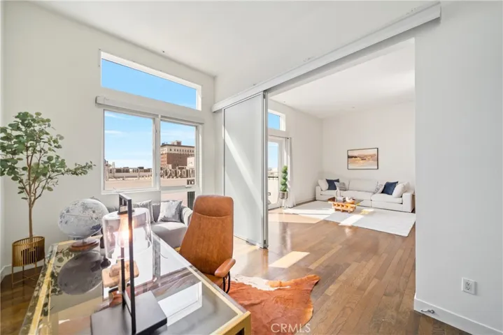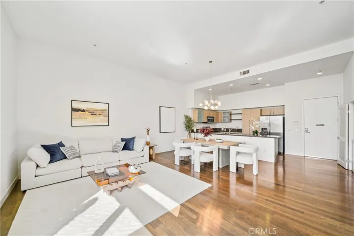 Soaring ceilings and floor-to-ceiling windows fill the open-concept living area with natural light, while wide-plank hardwood floors add warmth and elegance. The living space is tastefully furnished with high-end pieces that balance comfort and style.