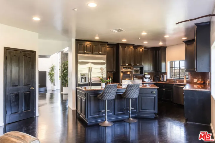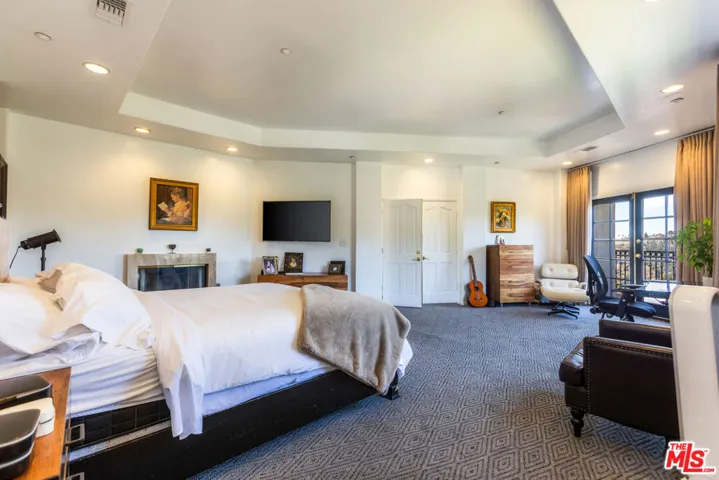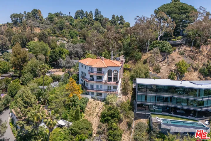 Experience breathtaking panoramic views from the Hollywood Hills to the Pacific Ocean in this gated, Contemporary Mediterranean estate, ideally located just minutes from Runyon Canyon. Spanning approximately 6,140 sq ft across four levels, this recently remodeled residence blends luxury with functionality. A grand entryway welcomes you into the dramatic great room, where soaring two-story ceilings and expansive windows flood the space with natural light. Enjoy wraparound balconies on every floor, offering sweeping views and seamless indoor-outdoor living.The entire top level is dedicated to an opulent primary suite featuring a walk-in closet, dual vanities, a private sitting room, and direct access to a private balcony. The chef’s kitchen includes a charming breakfast nook and opens to the balcony for alfresco dining.Ideal for both living and working, the home offers separate entrances for five guest bedrooms and a full maid’s quarters. Take the private elevator to a fully equipped custom gym and office, opening onto a grassy yard with room for a pool and unobstructed sunset vistas.Additional features include secure, gated parking for up to four vehicles and a state-of-the-art security system, ensuring both comfort and privacy in one of LA’s most sought-after neighborhoods.