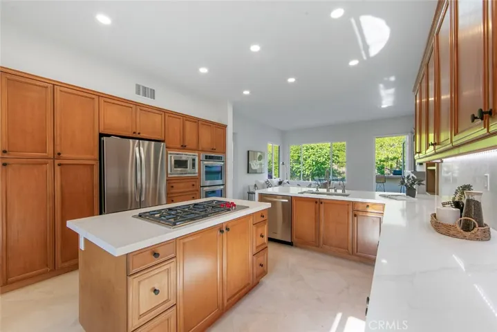 The open-concept layout flows effortlessly from the formal living room to the dining area, while the updated kitchen, with quartzite natural stone counters, a Wolf cooktop, double ovens, stainless steel appliances, and soft-close cabinetry, opens to a spacious family room with a cozy fireplace, perfect for everyday living and entertaining. The backyard is equally inviting, featuring a built-in BBQ area and ample space to relax or gather with friends.