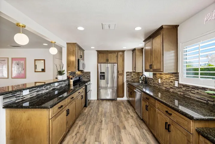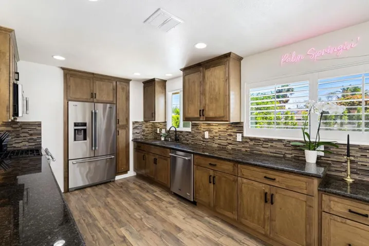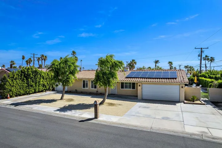 Gorgeous Updated Pool Home with Expansive Entertainer’s Backyard!Welcome to your desert retreat! This beautifully updated single-story home sits on a large lot and offers the perfect blend of indoor-outdoor living. The stunning backyard is lined with lush ficus trees and features a sparkling pool and spa with sleek concrete decking and AstroTurf–ideal for lounging under the sun or hosting unforgettable gatherings. Enjoy cool desert evenings around the built-in gas fire pit, all while taking in breathtaking views of the San Gorgonio Mountains.Inside, the home has been completely remodeled and designed with comfort and style in mind. As you enter, the open-concept living room and kitchen flow seamlessly, flooded with natural light. The spacious kitchen boasts granite countertops, a convenient bartop, and ample cabinetry. Adjacent to the kitchen is a generous dining area or breakfast nook with a charming bay window.Down the hall, you’ll find three bedrooms and two updated bathrooms. The primary suite opens directly to the backyard and includes an en suite bathroom for added privacy.Additional features include a two-car garage, RV access, and owned solar panels for energy efficiency. Whether you’re looking for a full-time residence, a seasonal rental, or a weekend getaway, this home offers it all–just minutes from Palm Springs and only 5 minutes to the I-10 freeway and the I-10 and Palm Springs International Airport. Enjoy diverse dining options nearby or explore local attractions such as golf courses, parks, tennis & pickle-ball courts, hiking trails, shopping centers & cultural venues all within 5-30 minutes of home.Don’t miss the opportunity to own this entertainer’s paradise in the heart of the desert!